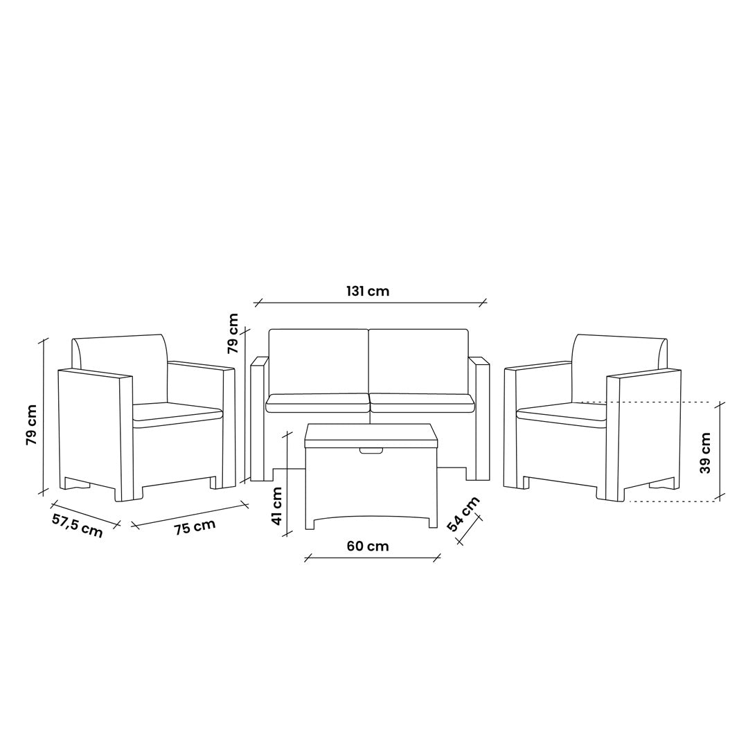 - Complete 4-seater set: 2 armchairs, 1 two-seater sofa, storage table, and 4 cushions