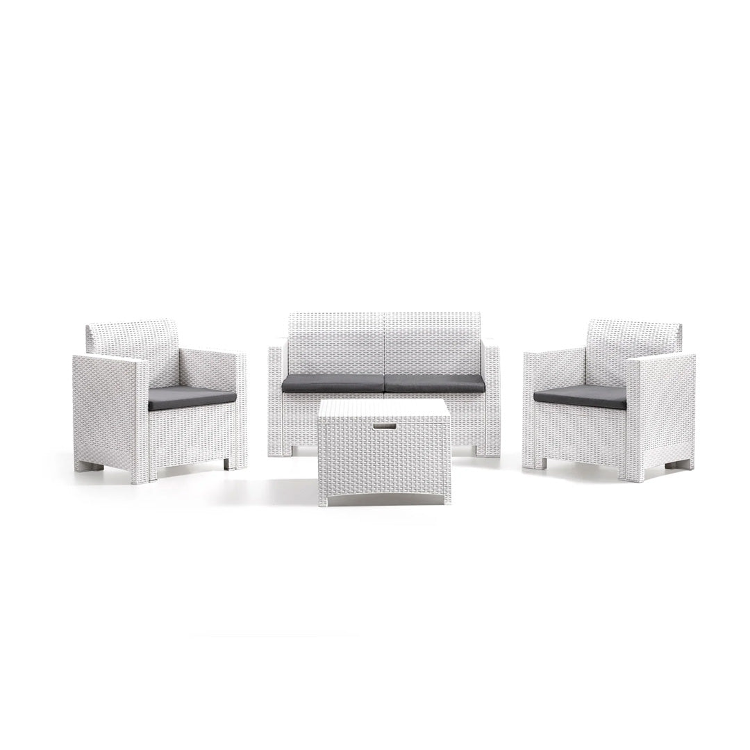 - Complete 4-seater set: 2 armchairs, 1 two-seater sofa, storage table, and 4 cushions