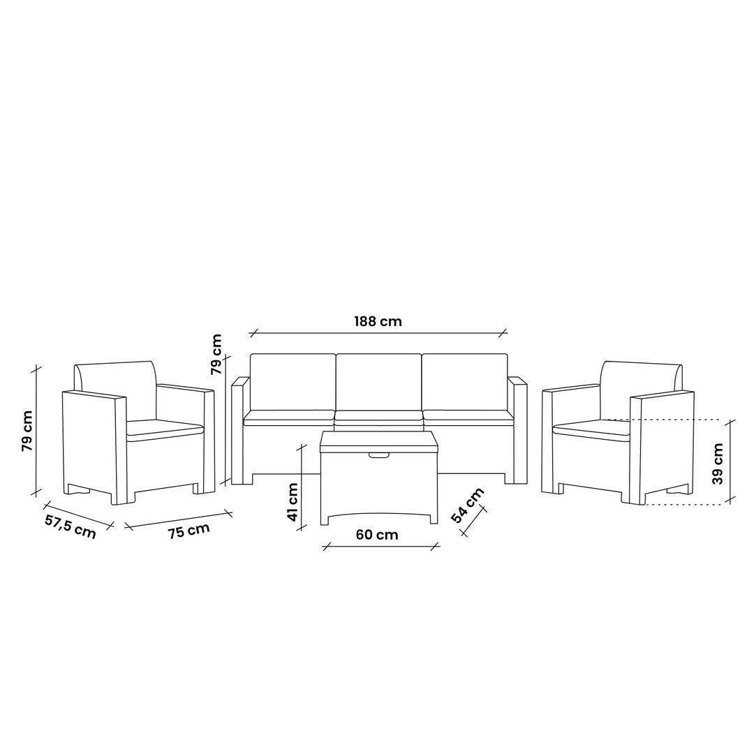 - Complete 5-seater outdoor set: 2 armchairs, 1 three-seater sofa, storage table, and 5 cushions
